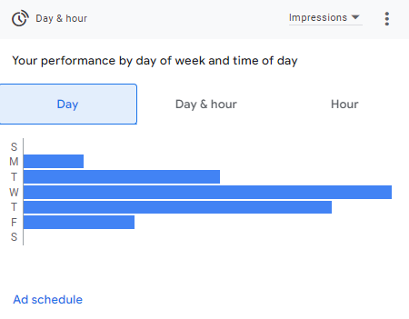 In terms of timing, impressions peaked between 12 PM and 6 PM, aligning with typical lunch and post-school/work hours. Performance was highest on Fridays, followed by Thursdays and Wednesdays, suggesting increased user interest leading into the weekend.