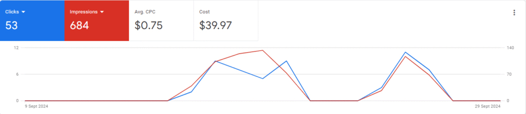The campaign received a total of 684 impressions and 53 clicks, resulting in a Click-Through Rate (CTR) of 7.75%. CTR is calculated using the formula: