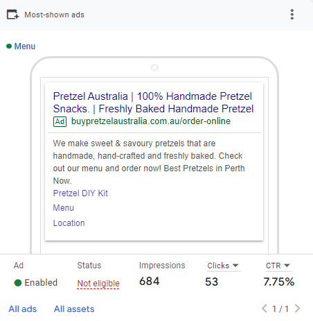 This project was part of my university unit (digital and interactive marketing). The goal was to run a one-week Google Ads campaign with a budget of $40 for a brand of your choice (Pretzel Australia).