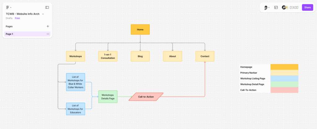 - Information Architecture: Developed a clear sitemap and navigation structure to group workshops logically and reduce clicks to key content.
