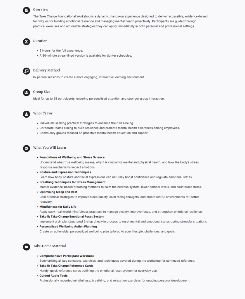 The redesigned website elevated Take Charge Wellbeing’s digital presence, making it visually appealing, structurally organised, and purpose-driven. Visitors can now easily explore workshops, understand their benefits, and submit enquiries without confusion or unnecessary clicks. The improved structure and copy have strengthened the brand’s professionalism and credibility, while the integration of analytics tools enables data-driven decisions for continuous improvement. Most importantly, the client now has the autonomy and resources to manage the site confidently, ensuring it remains a valuable asset for attracting and converting leads well into the future.